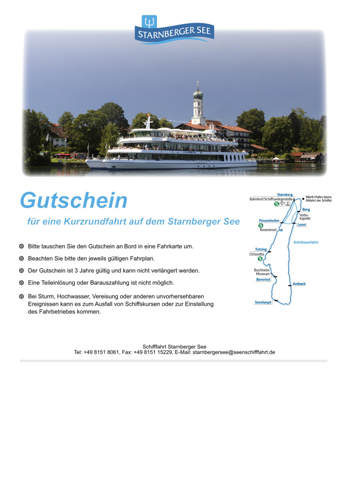 Auf einer Rundfahrt vorbei an eindrucksvollen Sehenswürdigkeiten an den Ufern des Starnberger Sees – eine Kreuzfahrt vor Alpenkulisse! Dauer der Kurzrundfahrt ca. 1 Std., Fahrtverlauf entsprechend dem gültigen Fahrplan.